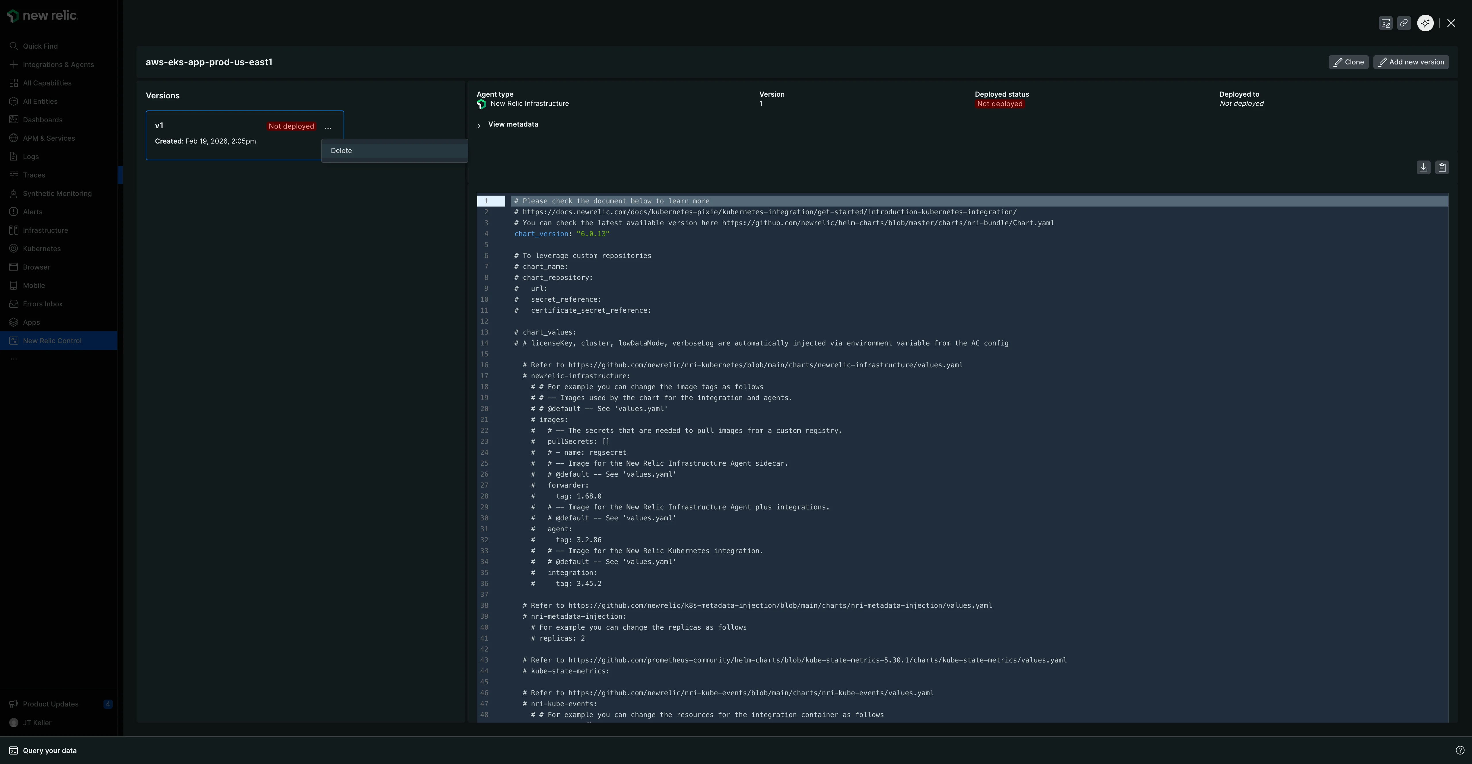 Exclusive infrastructure instrumentation: The system prevents you from deploying both the New Relic Infrastructure agent and the New Relic Distribution of OpenTelemetry Collector (NRDOT) to the same fleet. This validation helps prevent accidentally double-instrumenting your managed entities for infrastructure monitoring.