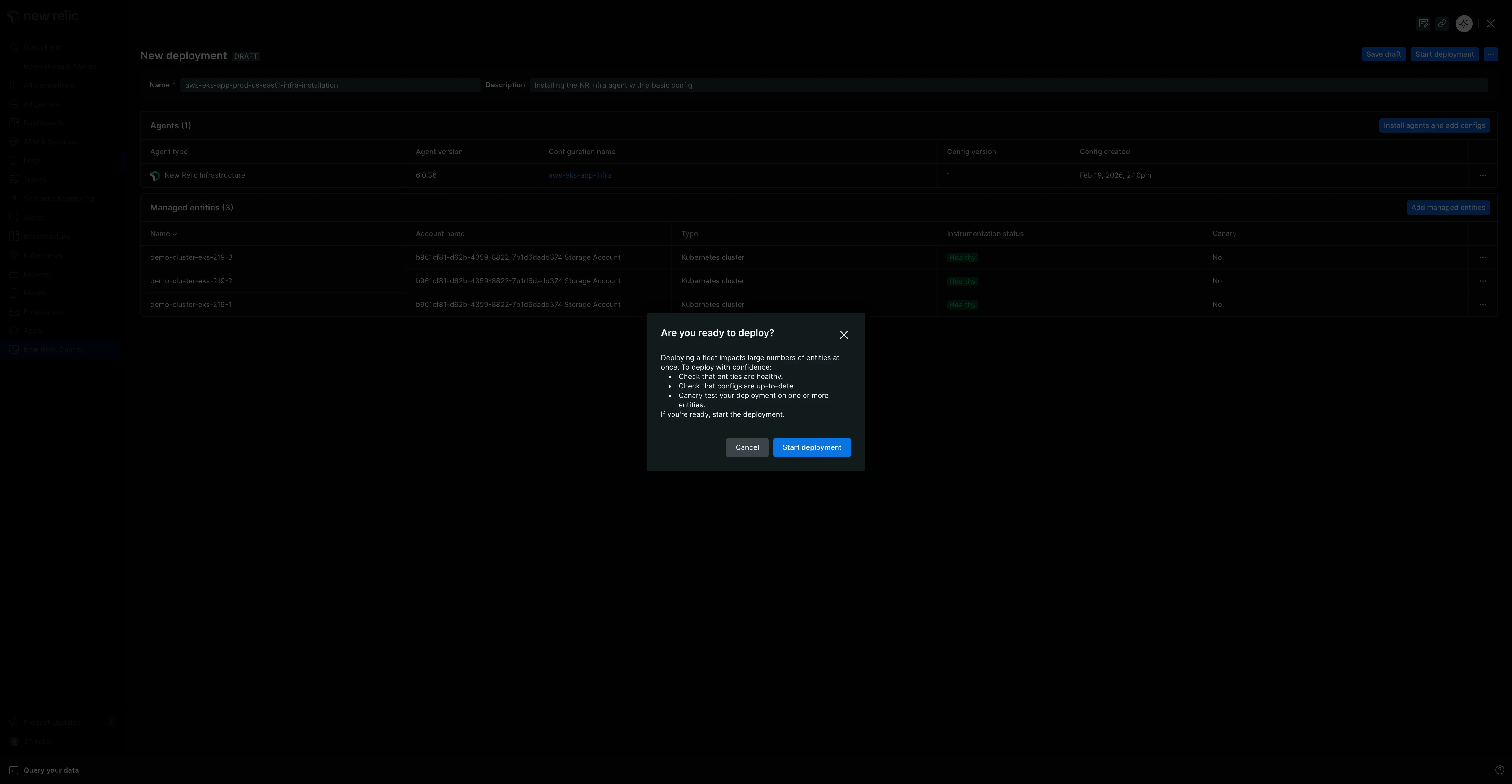 A deployment is a controlled set of actions that can install, delete, or configure agents on the managed entities in your fleet. Now you'll create one to deploy the New Relic Infrastructure agent.
