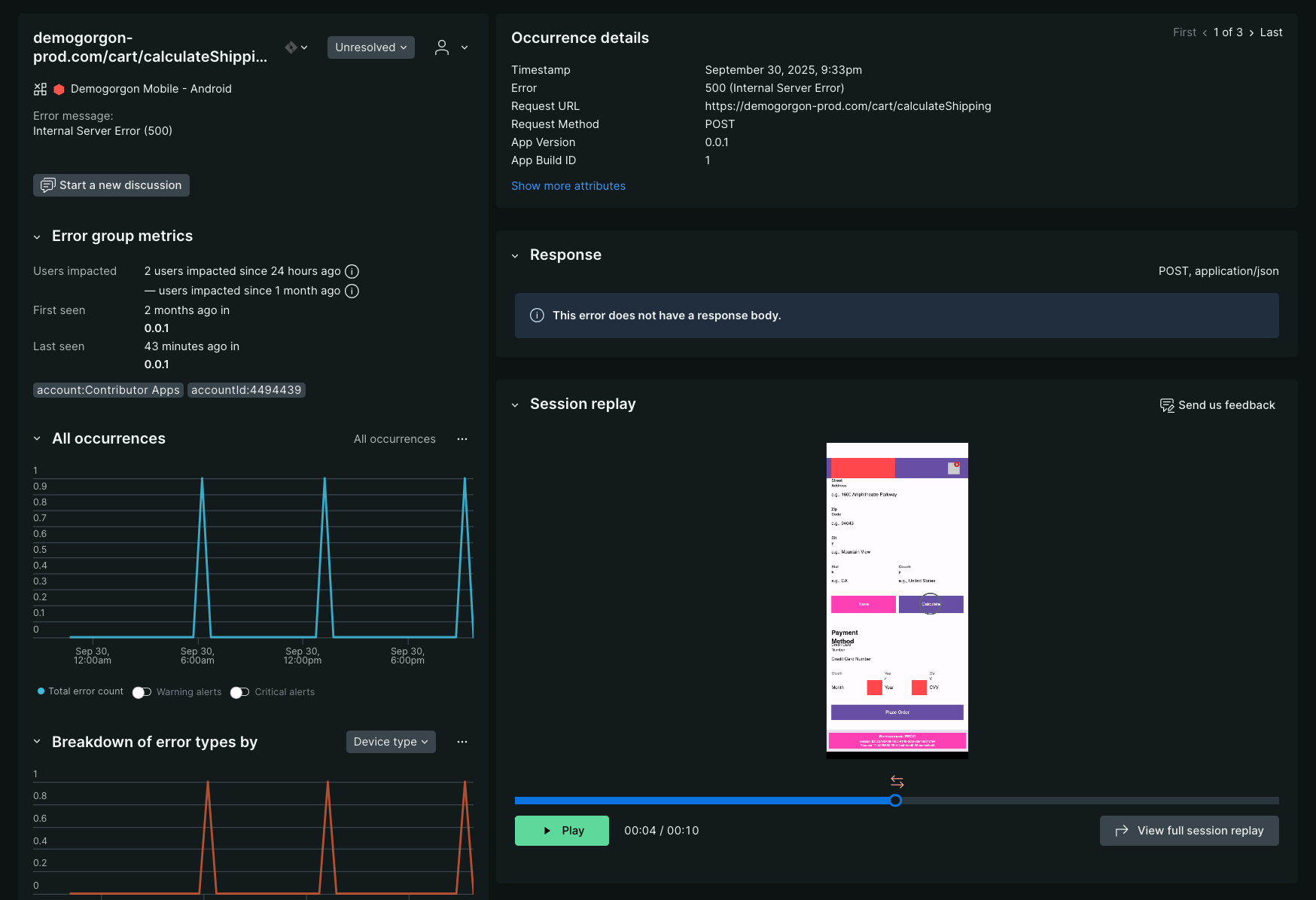 Why spend hours trying to reproduce elusive mobile app bugs when you can see exactly what your users experienced? Mobile Session Replay eliminates the guesswork in troubleshooting by providing a video replay of what the end user saw on their phone or tablet, synchronized with all the telemetry data from that session. This means you can quickly assess the real impact of errors on your users, identify performance bottlenecks and UX friction points, and resolve issues faster without relying on bug reports or local reproduction.