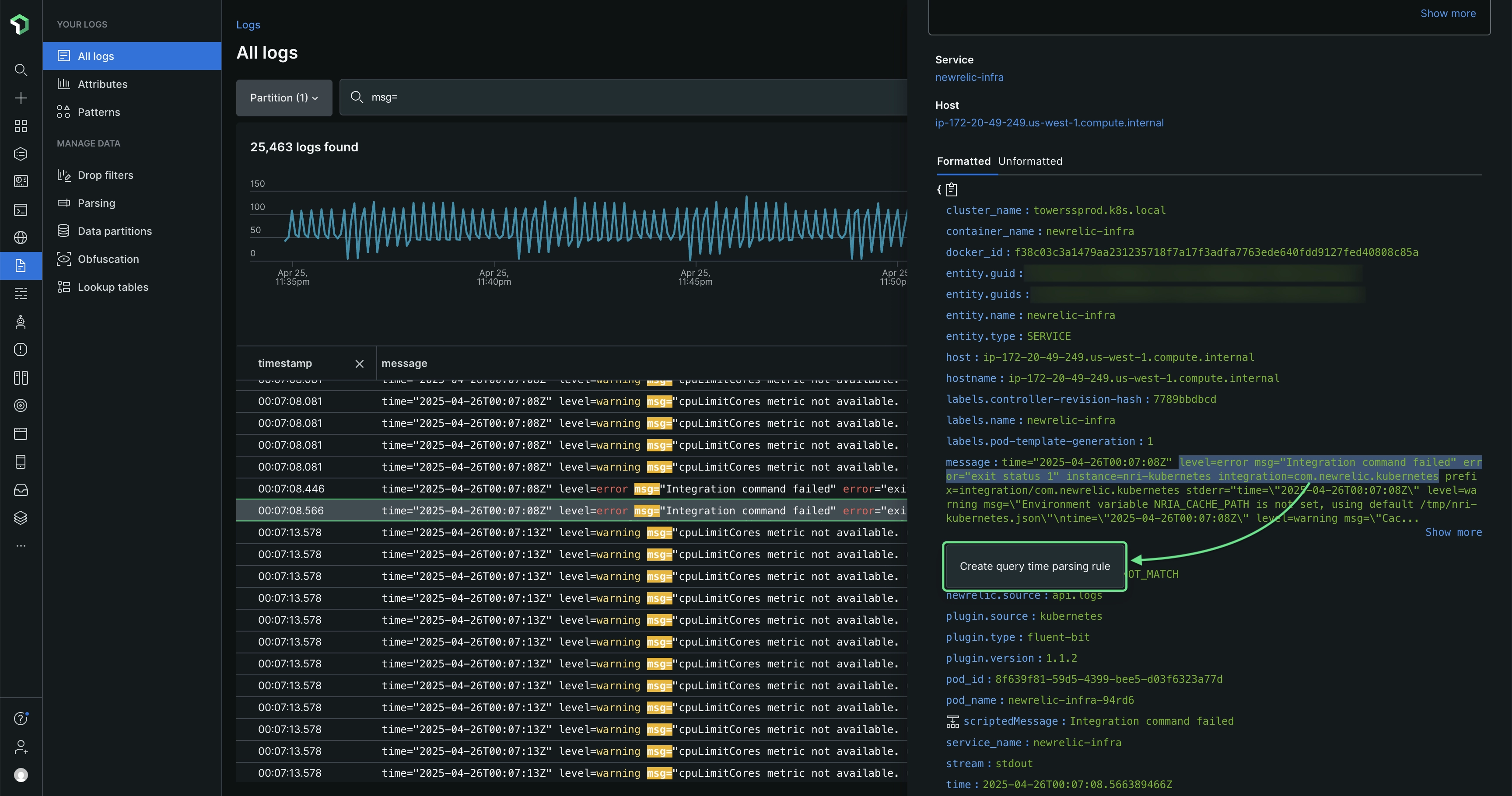 Are you looking for a quick way to visually extract attributes from your logs after they've been ingested into New Relic? Query time parsing lets you parse your logs directly in the UI without needing to write complex regular expressions or Grok patterns. You can use query time parsing to temporarily extract values from your logs and quickly perform a query on these variables. The results are shown instantly since parsing is performed at query time.