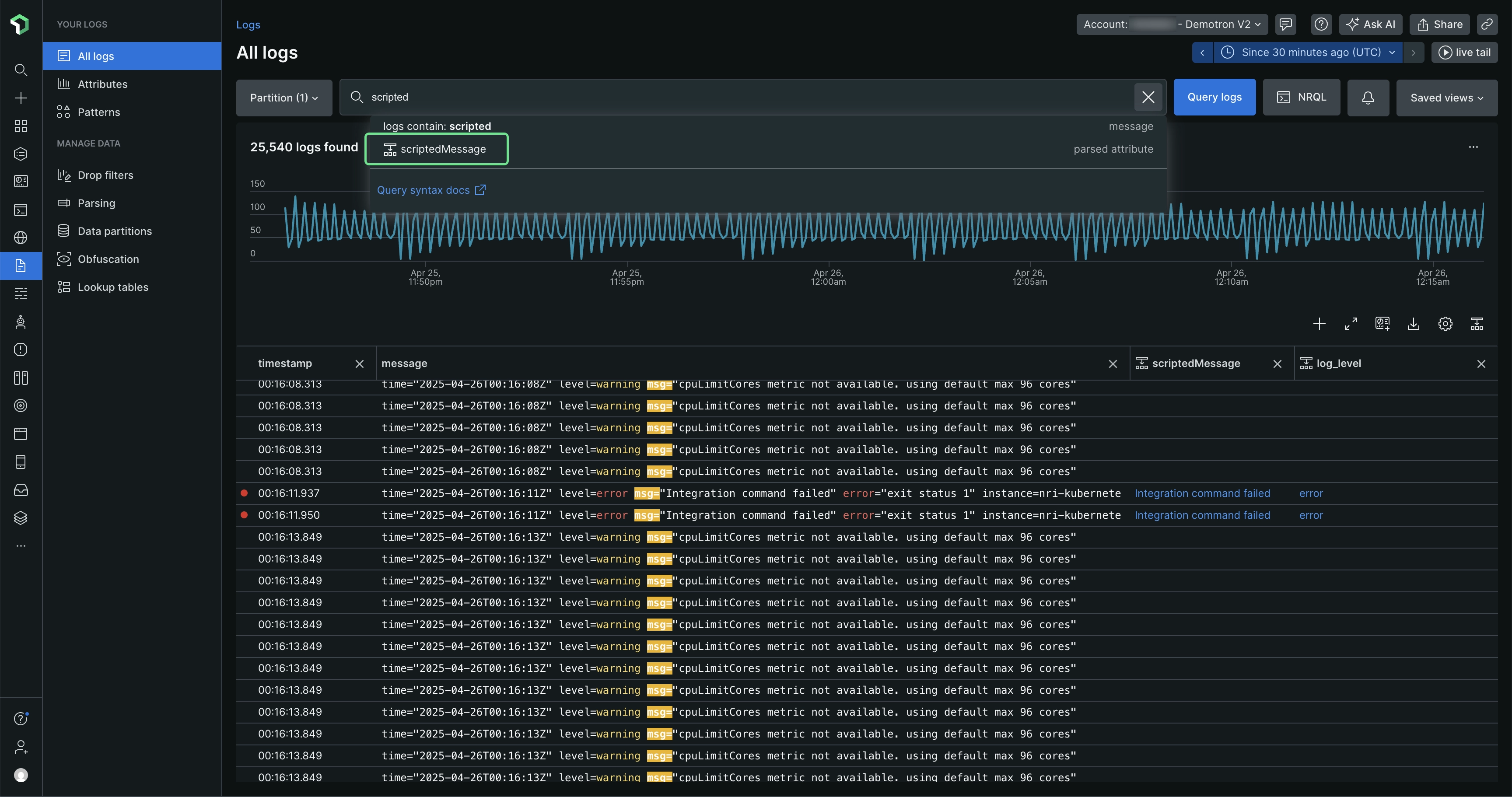 Query time parsing: In contrast to ingest parsing, query time parsing lets you create temporary attributes that will be used as query variables. You can then use these variables in NRQL queries to populate your log table. We automatically create the queries as you make selections in the UI.